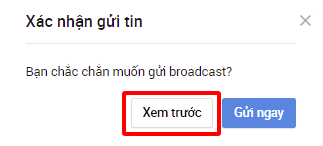 Bạn có thể xem trước nội dung hình ảnh/ hiển thị của tin broadcast sẽ gửi đến người theo dõi khi chọn “Xem trước” tại bước “Xác nhận gửi tin”. Xem thêm hướng dẫn gửi tin Broadcast tại đây