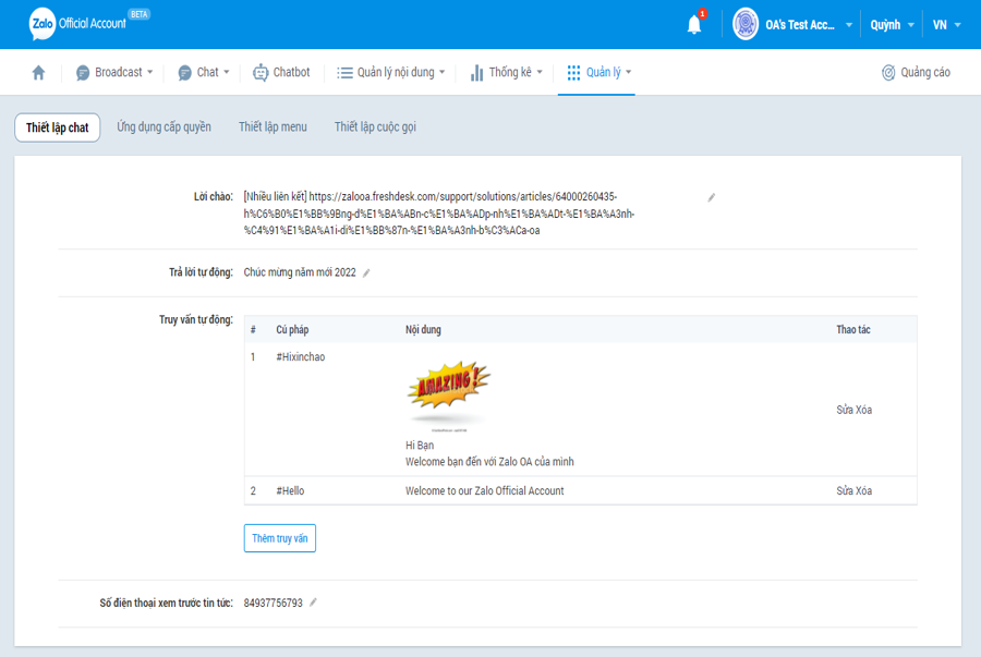 Lưu ý: Để xem trước tin broadcast, bạn cần thiết lập SDT sẽ nhận tin xem trước. Bạn có thể thiết lập SDT này tại trang Phần Quản lý ➞ Thiết lập tương tác ➞ Thiết lập chat ➞ Số điện thoại xem trước tin tức).