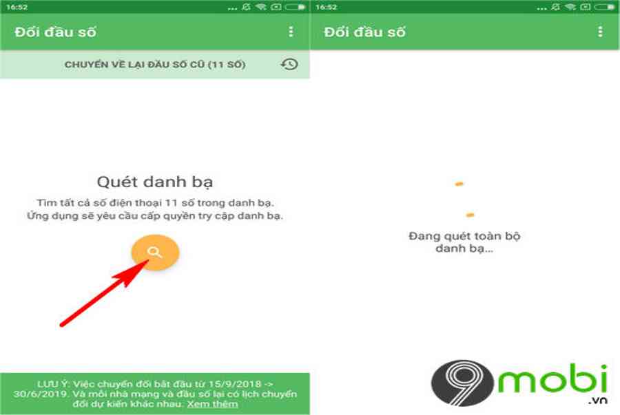 Bước 3 : Tại giao diện ứng dụng này, chúng ta sẽ ấn chọn biểu tượng Quét danh bạ để có thể thực hiện cách tìm danh bạ 11 số cần chuyển 10 số nhanh trên thiết bị của mình. Ứng dụng sẽ ngay lập tức thực hiện tìm kiếm các danh bạ 11 số cũ cần phải cập nhật lại.