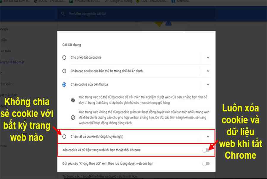 Bước 5: Ở phần Cài đặt chung > Chọn Chặn tất cả cookie (nếu bạn không muốn chia sẻ cookie với bất kỳ trang web nào) hoặc Xóa cookie và dữ liệu trang web khi bạn thoát khỏi Chrome.
