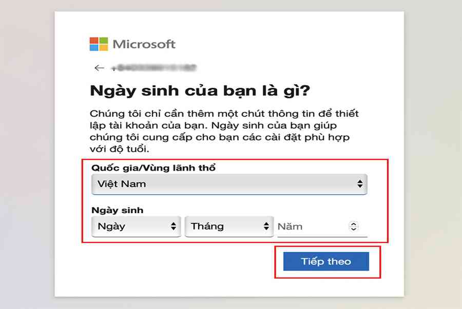Bước 4: Nhập thông tin Quốc gia Ngày sinh của bạn > Nhấn Tiếp theo.
