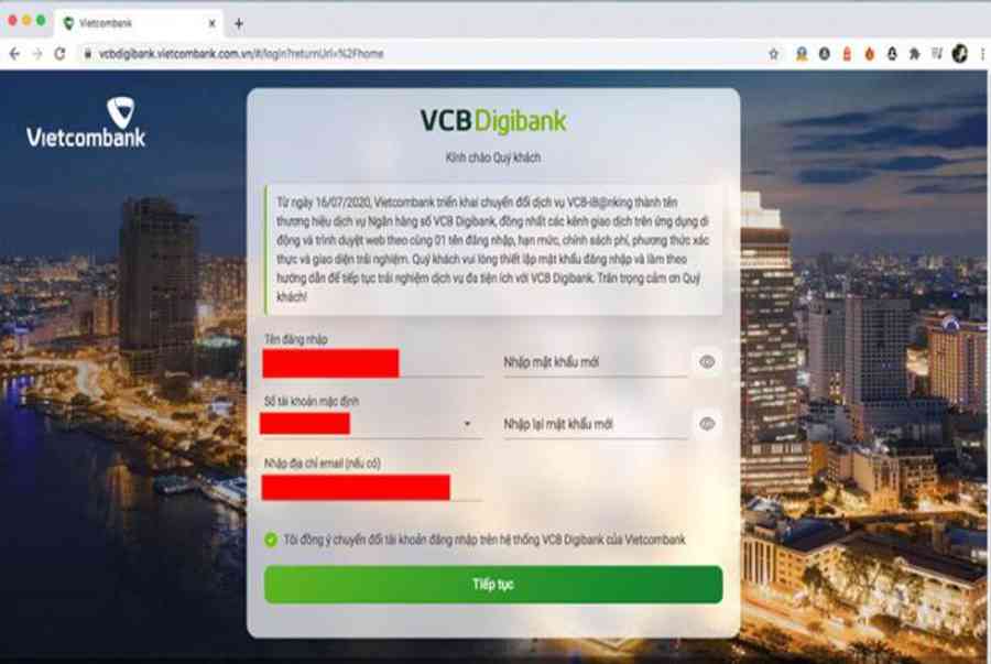 Bước 2: Tại giao diện VCB Digibank, chúng ta sẽ  hập thông tin Địa chỉ email (nếu có), Tên đăng nhập như cũ và đặt 1 mật khẩu mới. Sau khi điền đầy đủ thông tin hãy click Tiếp tục.