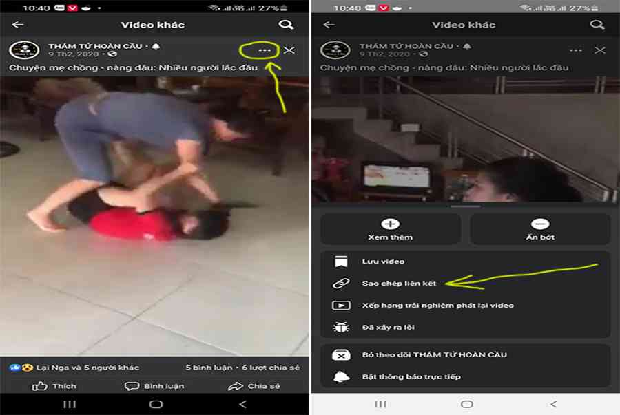 Đầu tiên, các bạn đăng nhập vào tài khoản Facebook cá nhân của mình, sau đó lướt News Feed, khi thấy video nào hay mà bạn muốn tải nó về điện thoại thì các bạn bấm vào video đó và chọn dấu 3 chấm ở trên tiêu đề của video. Tiếp theo nó sẽ hiển thị ra các công cụ hỗ trợ, các bạn chọn vào mục sao chép liên kết để tiến hành. Xem hình bên dưới