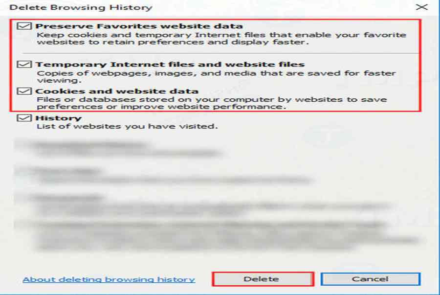 Bước 3: Trên cửa sổ Xóa lịch sử duyệt web, hãy kiểm tra các mục Bảo tồn dữ liệu trang web Yêu thích, tệp Internet tạm thời và tệp trang web và Cookie và dữ liệu trang web sau đó bấm vào nút Xóa bỏ.