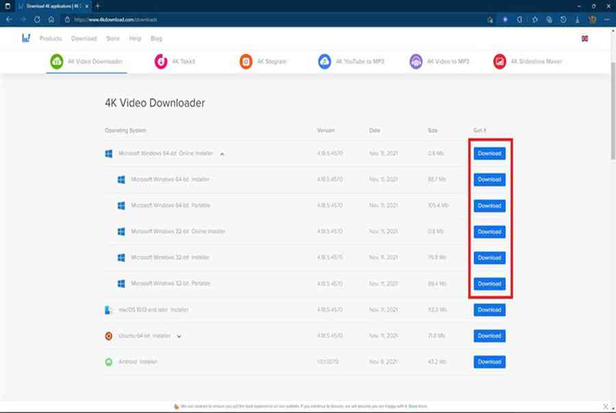Bước 1: Bạn cần tải về máy tính ứng dụng 4K Video Downloader(Bạn truy cập vào link bên dưới để tải) > Lựa chọn phiên bản phù hợp cho máy tính của mình và nhấn vào Dowload là được.
