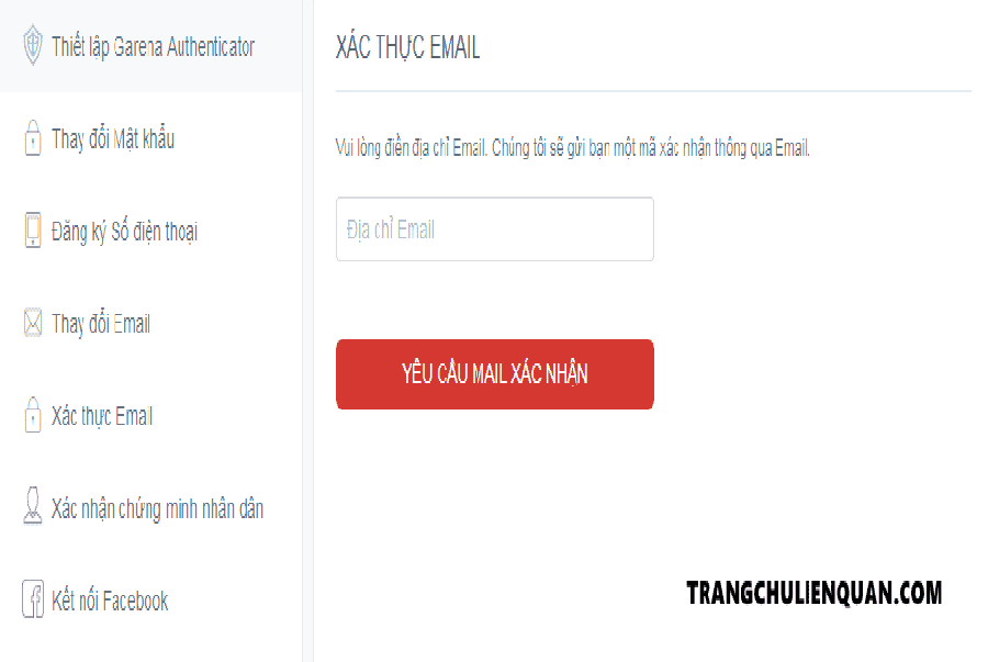 - Xác thức email: Nhập địa chỉ email của bạn và “Yêu cầu mail xác nhận”. Đăng nhập vào email của bạn để nhấn vào hòm thư để xác nhận.