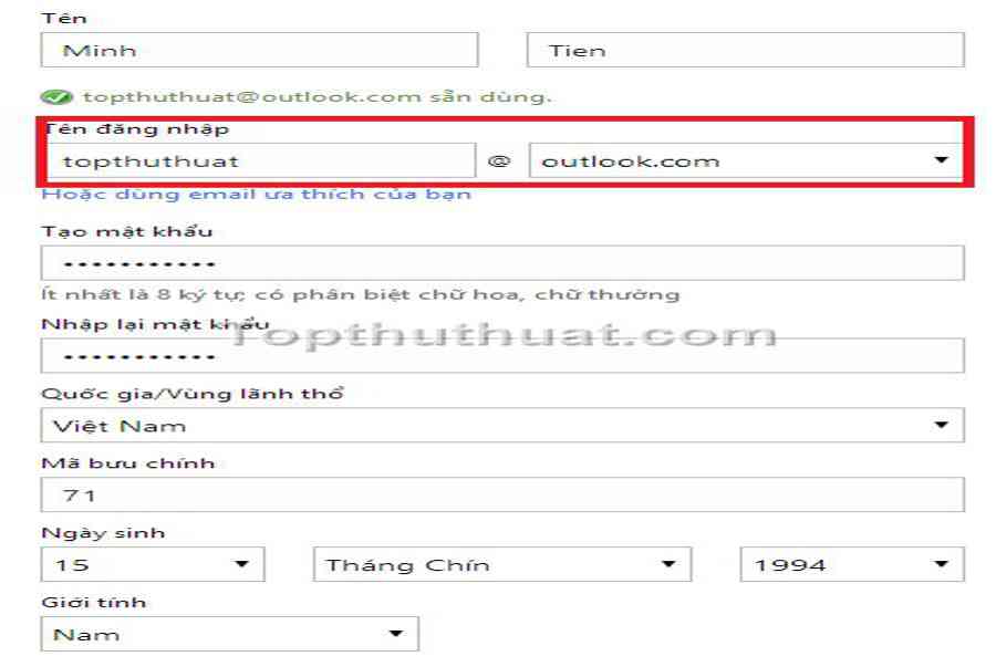 Lưu ý: Ở phần đăng nhập. Bạn có thể sử dụng tên Email mà bạn đã đăng ký từ Yahoo hoặc Gmail làm tên đăng nhập. Nếu bạn muốn sử dụng đuôi @ là outlook.com, bạn hãy chọn đuôi này hoặc có thể lấy địa chỉ Email mới. Và điền tên Email Outlook mà bạn muốn sử dụng.