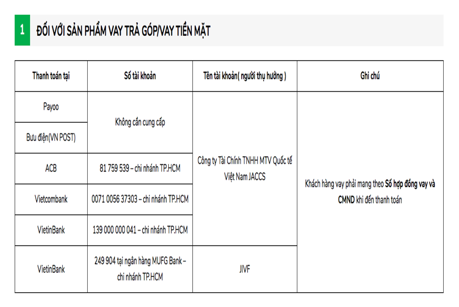 có ngay trong ngày Hiện nay ĐK vay, JACCS có 2 kênh giao dịch thanh toán khoản vay dành cho người mua là mạng lưới hệ thống thu hộ không tính tiền vay tiền nợ xấu hoặc ngân hàng nhà nước có thu phí :+ Thanh toán không tính tiền tại mạng lưới hệ thống thu hộ