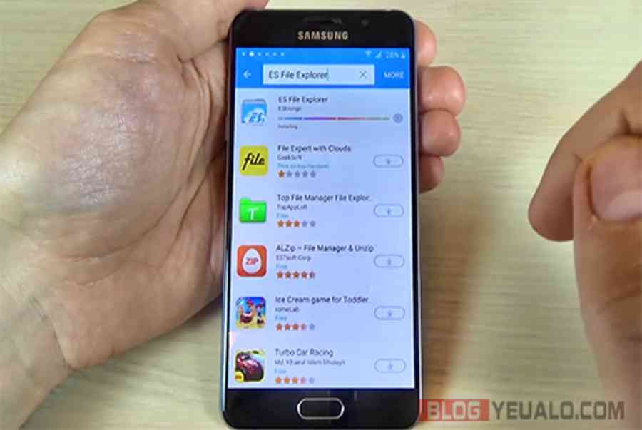 Nhập vào ô tìm kiếm phần mềm quản lý file có tên là “ES File Explorer” rồi chọn cài đặt phần mềm này. Khi cài đặt phần mềm máy sẽ đòi tài khoản Samsung account . Nếu bạn có rồi thì có thể đăng nhập và tải phần mềm quản lý file này về ngay. Còn nếu chưa có thì hãy vào Create account để đăng ký.